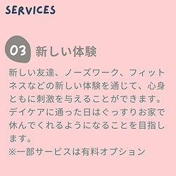 2025年9月からスタートした【Daycare】 デイケアではワンちゃんをお預かりして、お友だちとの関わりやトレーニングを通して「楽しい!」「できた!」をたくさん増やしていきます はじめての子も、ちょっぴりドキドキな子もその子のペースを大切にしたデイケアです ・Daycareサービス スケジュール 日時:毎月第3水曜に開催予定 9:00〜15:00 ※月によって複数回開催など日程変わることあります ※3月は4日(水)と26日(木)の開催となりました。4日は特別なフィットネスプログラムを行います ・場所:鹿嶋市わんわん村内ドッグラン https://maps.app.goo.gl/5pCkPaLv82qHmQXx5?g_st=ipc ・料金(税込)/頭:20kg未満 5,000円、20kg以上 7,000 ・持ち物: フード/おやつ/クレート/首輪またはハーネス/リード ※当日の様子は写真とレポートでお渡しします ※以下オプションサービスは有料です ・時間外の送迎(朝9時前のお送り、夕方16時以降のお迎えなど) 30分ごとに1000円 ・クレート持参なし(クレートに入れない子向け) 1000円 ・歯ブラシ、ブラッシングなどのグルーミング 1000円 ・ドッグマッサージまたはメディセル施術 20分2000円 ・ドッグフィットネス 20分2000円 ・問題行動アドバイス 20分2000円 ※ご注意事項 安心してご利用いただくために、事前に利用規約をご一読ください。 お申込み完了時点で、規約にご同意いただいたものとしてお手続きを進めさせていただきます。 ※オプションサービスの申込方法 お支払い時に選択いただきます。本ホームページで申込完了後、メールにてお支払い方法をご案内しますので、支払い時にオプションサービスをご選択ください。