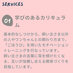 デイケアではワンちゃんをお預かりして、お友だちとの関わりやトレーニングを通して「楽しい!」「できた!」をたくさん増やしていきます